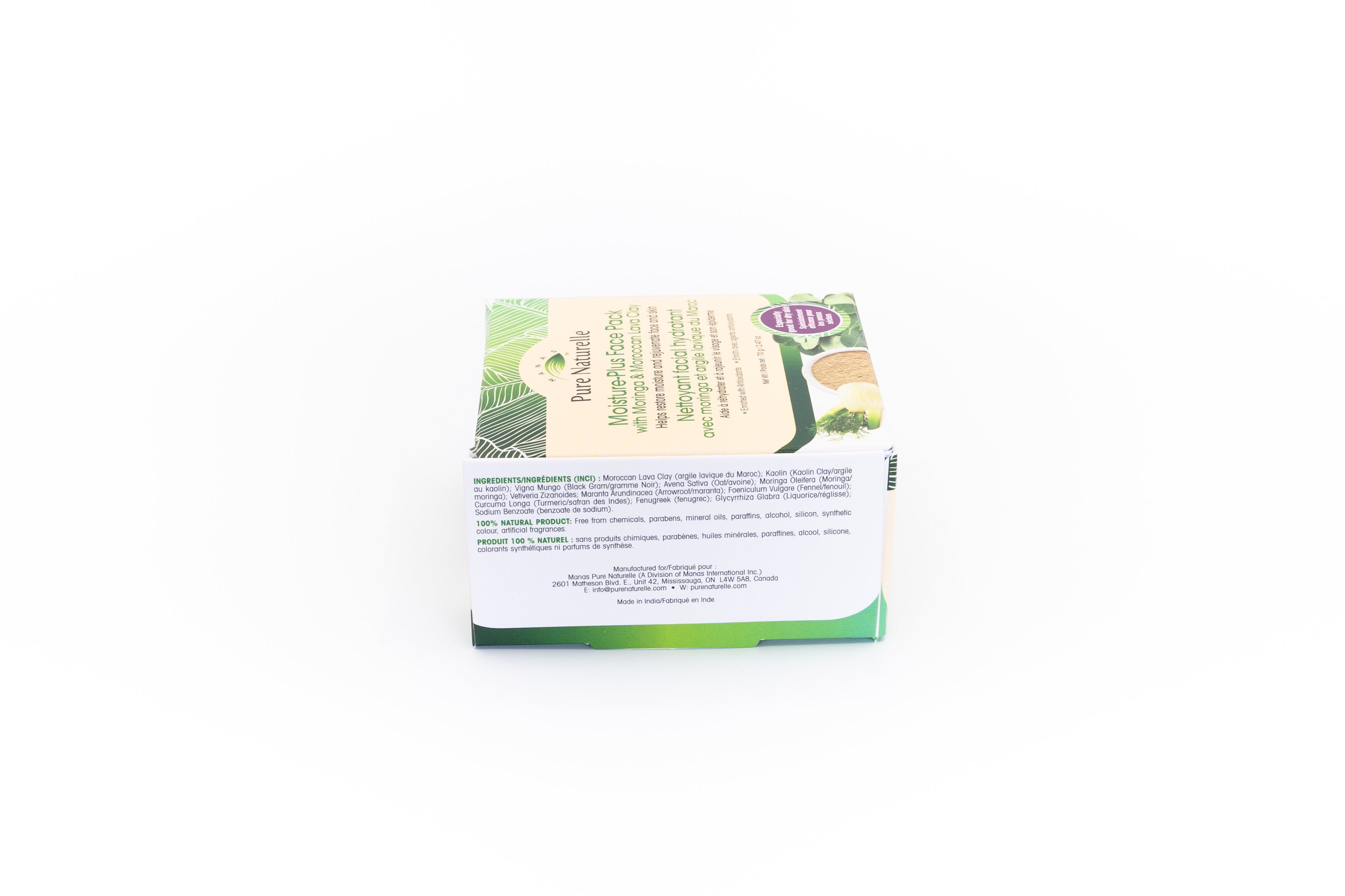 Moroccan Lava Clay (argile lavique du Maroc); Kaolin (Kaolin Clay/argile au kaolin); Vigna Mungo (Black Gram/gramme Noir); Avena Sativa (Oat/avoine); Moringa Oleifera (Moringa/moringa); Vetiveria Zizanoides; Maranta Arundinacea (Arrowroot/maranta); Foeniculum Vulgare (Fennel/fenouil); Curcuma Longa (Turmeric/safran des Indes); Fenugreek (fenugrec); Glycyrrhiza Glabra (Liquorice/réglisse); Sodium Benzoate (benzoate de sodium).